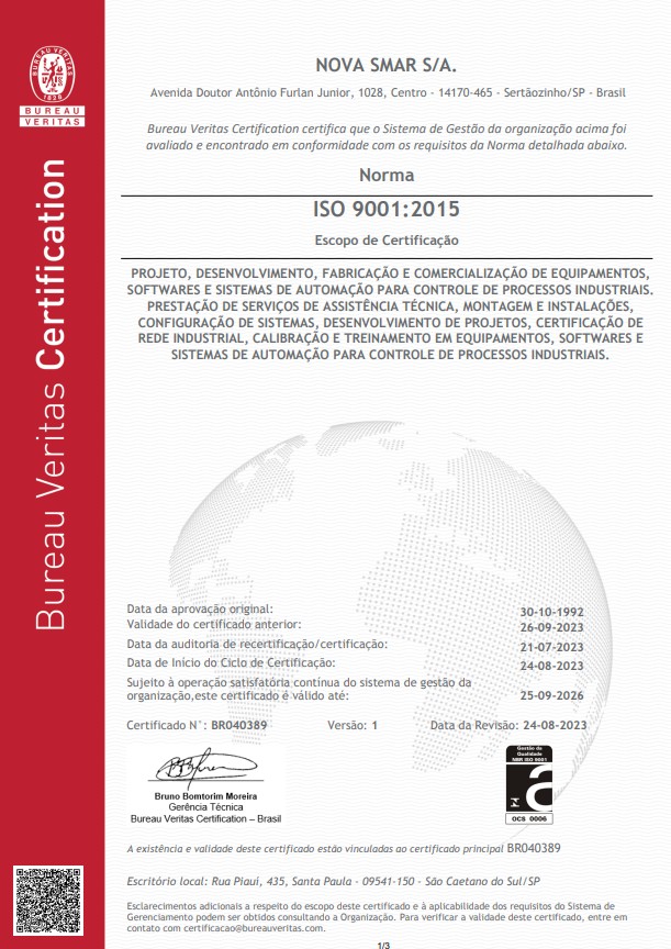 Since 1992, SMAR has held ISO 9001 certification, being a pioneer in the Brazilian electromechanical and electronics sector. Its Quality Management System is audited by independent organizations and complies with strict international standards, including ATEX, IECEx, and guidelines from the International Organization for Standardization.